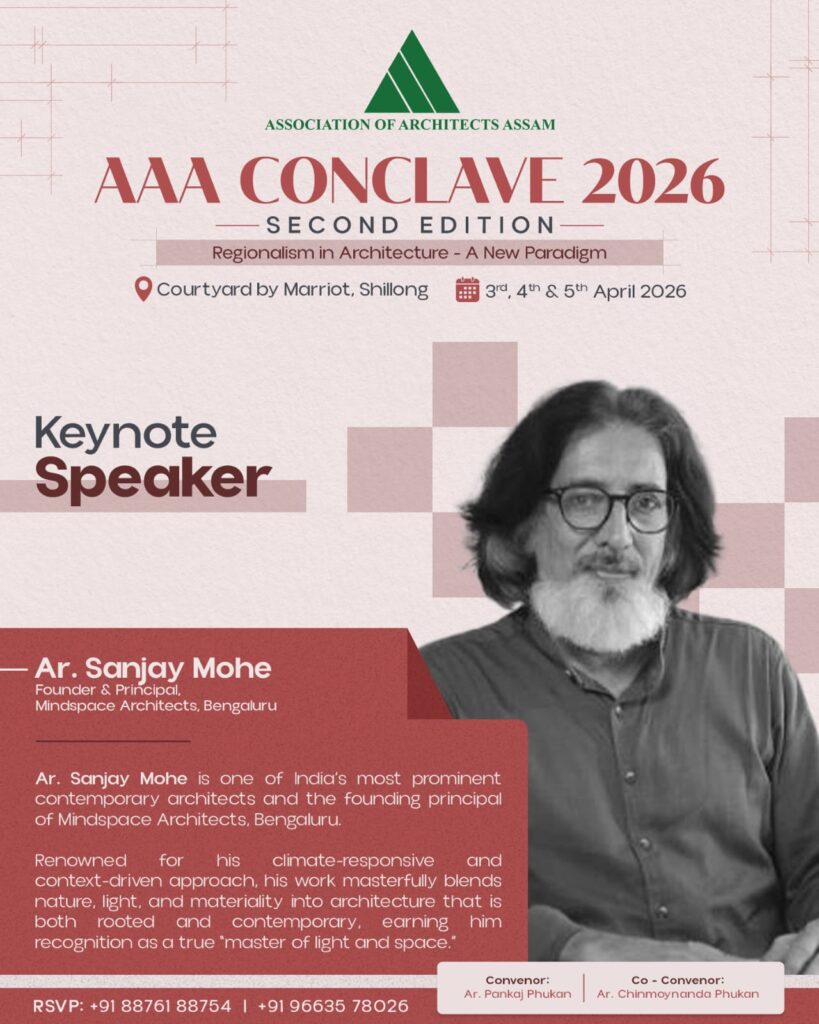 Join the Association of Architects Assam for the second edition of the AAA Conclave, featuring a keynote address by the “Master of Light and Space,” Ar. Sanjay Mohe. Known for his climate-responsive and context-driven designs, the founder of Mindspace Architects will lead our exploration into “Regionalism in Architecture – A New Paradigm.”